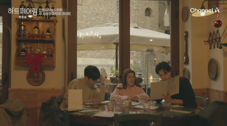 셋은 레스토랑에서 밥을 먹고, 찬형과 하늘이 많이 가까워지는 듯한 분위기였습니다.