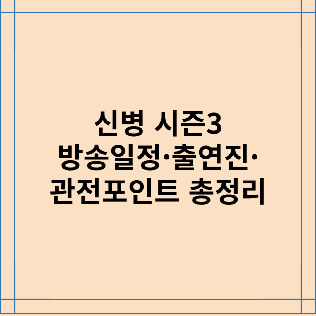 군드라마 끝판왕이 돌아왔다!현실 고증은 기본, 웃음과 긴장감까지 다 잡은 ‘신병3’가 드디어 시작됩니다.이번 시즌, 과연 박민석의 군생활은 무사할 수 있을까요?   목차프로그램 소개프로그램 일정출연진 소개시청 포인트  프로그램 소개  '신병3'는 상병 진급을 앞둔 '군수저' 박민석이 예측 불허의 두 신병 전입과 역대급 빌런의 복귀로 인해 난이도가 급상승한 군 생활을 겪는 이야기를 그린 하이퍼 리얼리즘 코미디 드라마입니다.이번 시즌에서는 혹한기 훈련 등 더욱 현실감 있는 군대 에피소드들이 전개될 예정입니다.프로그램 일정 방송 채널: ENA​방송 기간: 2025년 4월 7일부터 매주 월요일과 화요일 밤 10시 방송 VOD 서비스: 본방송 직후 KT 지니TV에서 무료 VOD 독점 제공 OTT 서비스: 티빙(..